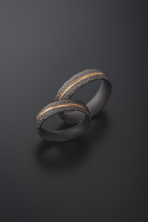 Trauringe im "Vintage"-Stil aus 750 Roségold und Titan mit Hammerschlagstruktur.
